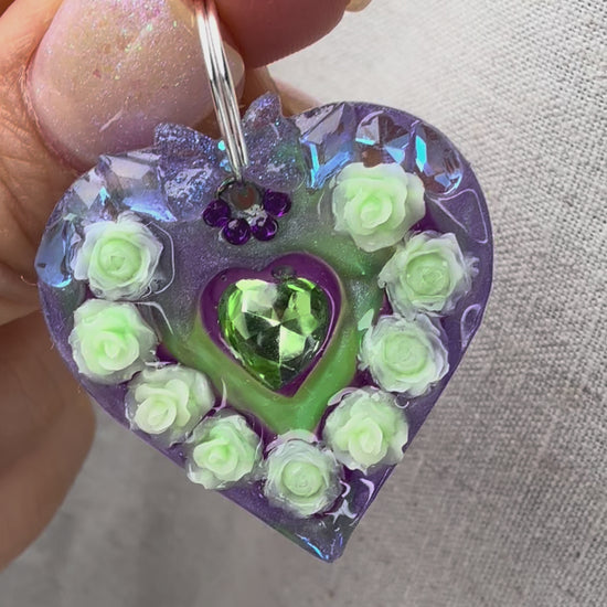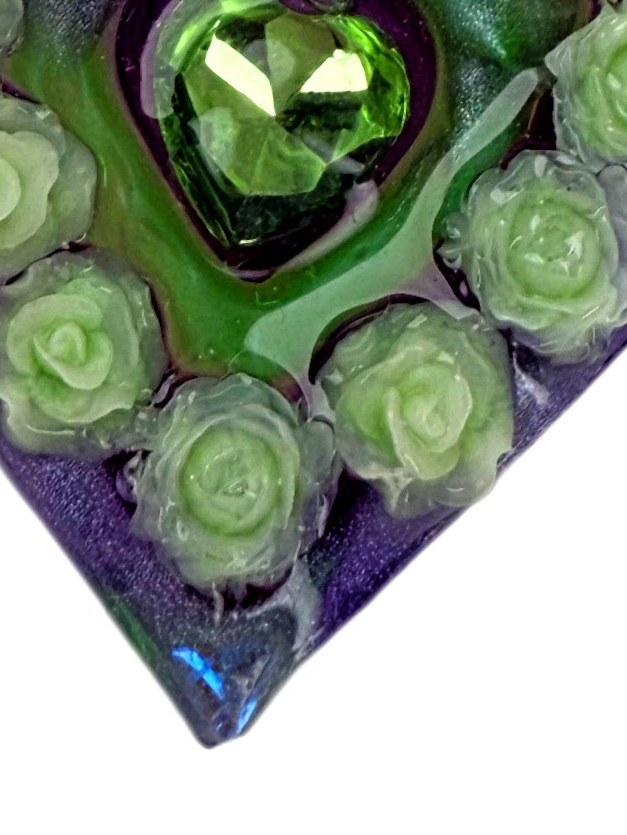 A jewel tag for dogs offering a beautiful bouquet of green roses in a bed of iridescent purple shimmer with a centre green emerald rhinestone heart. A touch of bling and originality giving elegance to any dog's look.