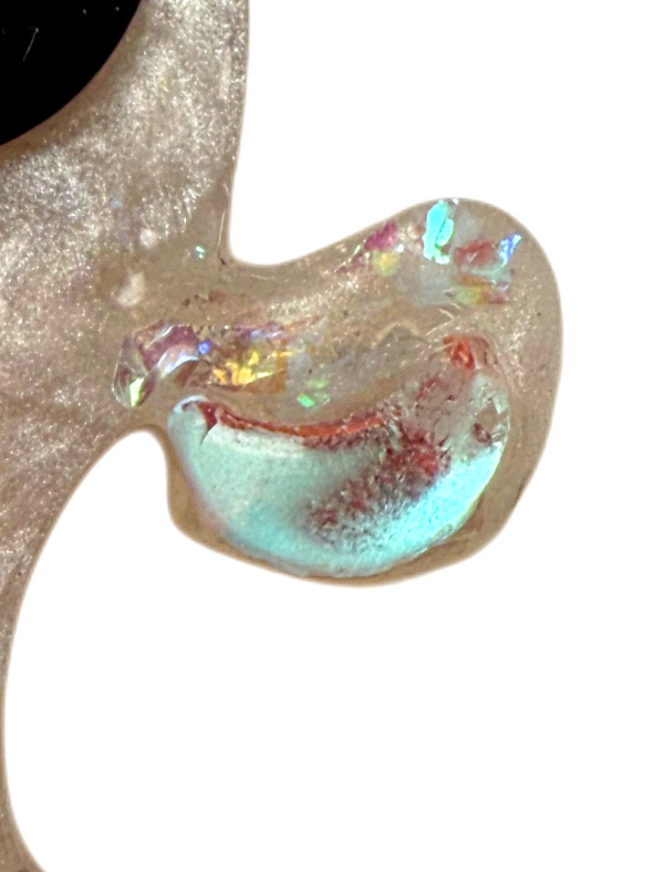 This dog jewel tag combines a pearlescent, ghostly white with a tinge of ancient gold in colour, and embellishments of iridescent and sparkly crystals giving a sensation of electric power in the reflections of the light. Its eyes as black as the night,