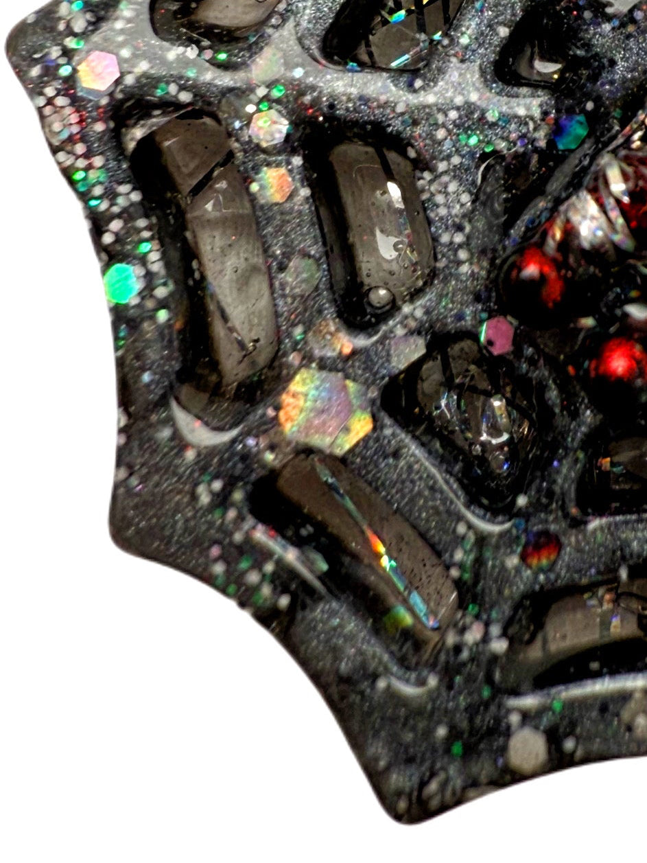 Designed to be worn on the dog collar, it features a rhinestone bling spider, its web wrapped prey, a bloody rabbit struggling to get free from its impending doom lying helplessly in a sparkly dark web with holographic webbing threads on the the reverse.